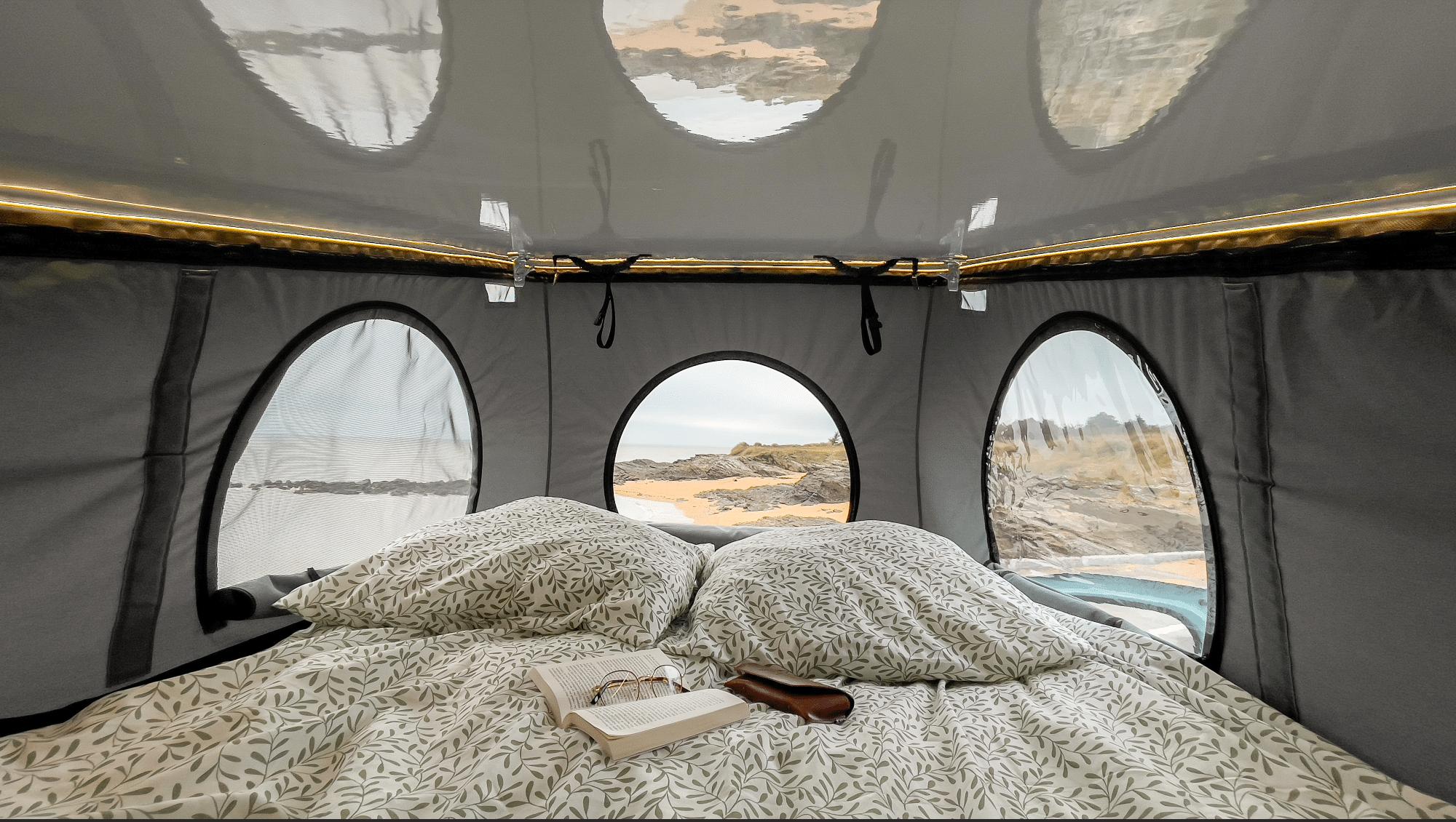 Nous avons développé notre propre toit relevable depuis plusieurs années qui est aujourd’hui le plus léger du marché. Conçu pour être facile à manipuler, il est équipé d’une toile innovante, à la fois respirante et étanche, assurant une ventilation optimale tout en protégeant des intempéries. Son lit intégré supporte une charge de 2×100 kg, offrant des nuits confortables pour deux personnes.